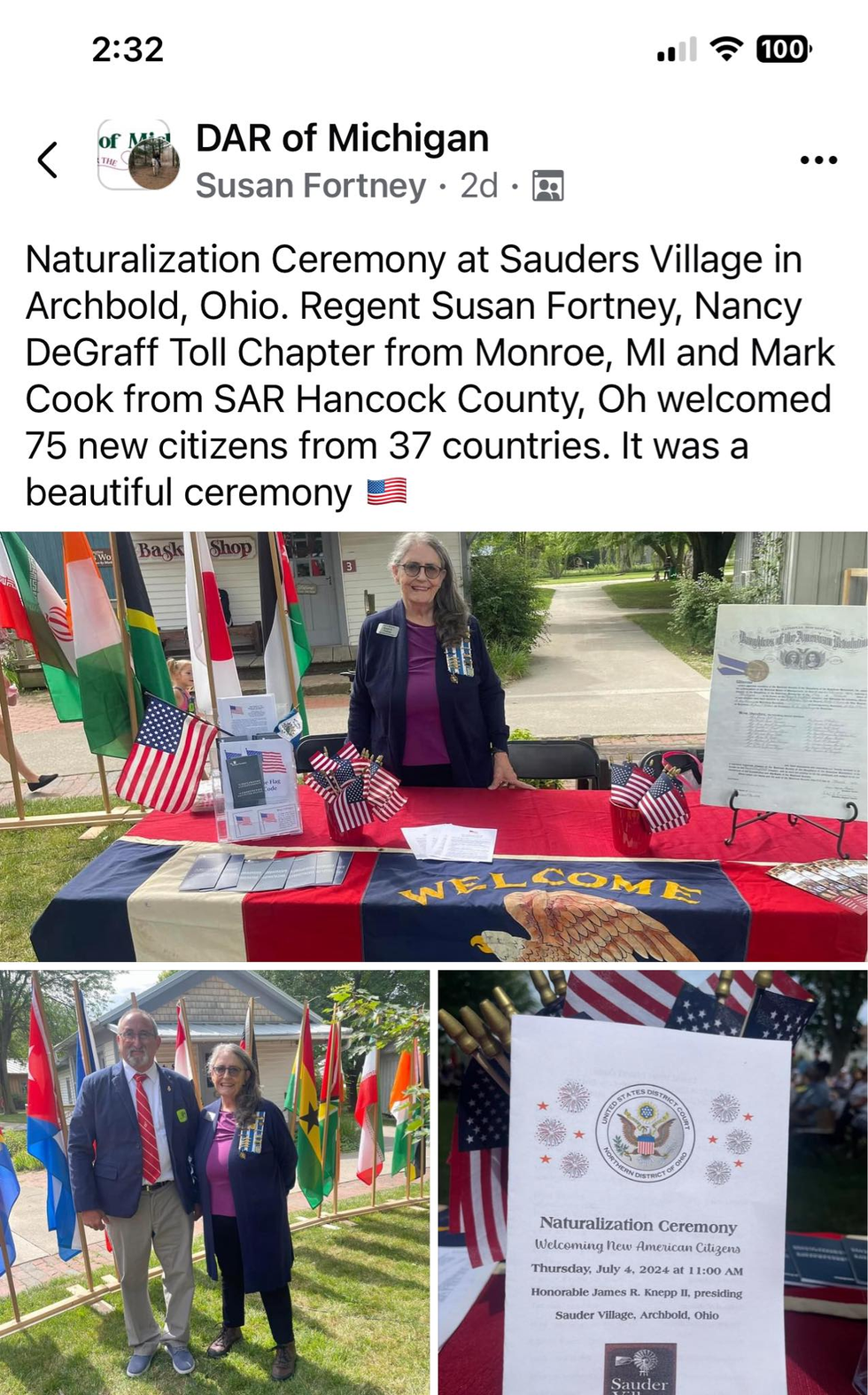 The Naturalization Ceremony was held at Sauder Village in Archbold Ohio. Welcoming 75 new citizens from 37 countries. In attendance was John Hancock Chapter Secretary/Historian Mark Cook, Brittany Cook DAR member and President of the Dorothy Quincy Hancock Auxiliary and member Angela Cook.