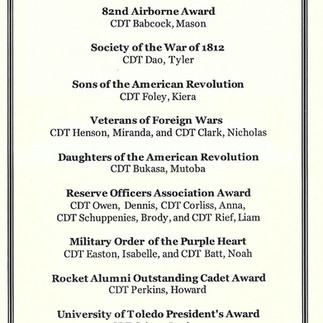 The U.S. Army Reserve Officers' Training Corps Spring Awards Ceremony was conducted at Doerman Theater on the campus of the University of Toledo April 25, 2024. Here President Stobbs is presenting Cadet Kiera Foley her award. President Stobbs and Secretary Cook attended.